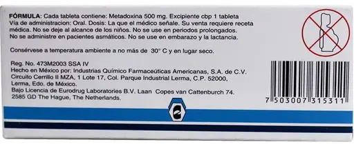 PIEZAAbrixone 500 mg es un medicamento en tabletas que contiene Metadoxina, un principio activo utilizado para tratar trastornos hepáticos y mejorar el metabolismo del alcohol en el cuerpo. Es efectivo en el tratamiento de la intoxicación alcohólica aguda y en la desintoxicación del hígado, ayudando a reducir los efectos del alcohol y mejorar la función hepática. Se recomienda su uso bajo supervisión médica.