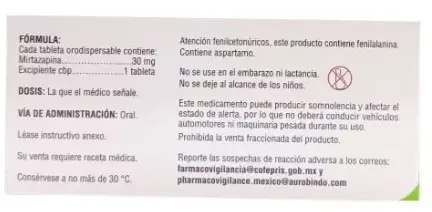 PIEZAMirtazapina Orod 30 mg 30 tabletas contiene mirtazapina, un antidepresivo utilizado principalmente para tratar la depresión y los trastornos de ansiedad. Actúa equilibrando los neurotransmisores en el cerebro, como la serotonina y la norepinefrina. Las tabletas son de disolución rápida, facilitando su ingesta. Su uso debe ser bajo prescripción médica y con supervisión adecuada debido a posibles efectos secundarios.