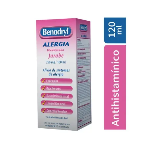 PIEZABenadryl 0.25 g Jarabe 120 ml (Difenhidramina) es un medicamento antihistamínico utilizado para aliviar los síntomas de alergias, como picazón, estornudos y congestión nasal. También se usa para tratar el insomnio ocasional y el malestar por resfriados. Se debe administrar según las indicaciones del médico o el prospecto.