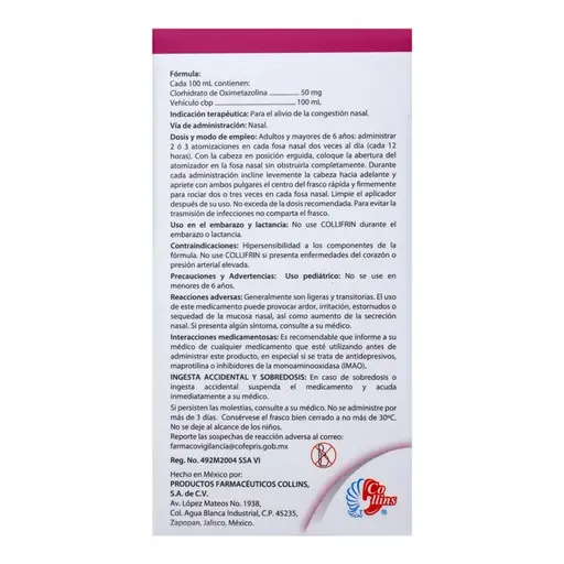 PIEZACollifrin 0.05% es una solución para adultos de 20 ml que contiene oximetazolina, un eficaz descongestionante nasal. Esta fórmula está diseñada para aliviar rápidamente la congestión nasal causada por resfriados, sinusitis o alergias, proporcionando una fácil respiración. Su efecto prolongado ayuda a reducir la inflamación y la hinchazón en las vías respiratorias. Se recomienda seguir las indicaciones del médico y no exceder la dosis recomendada.