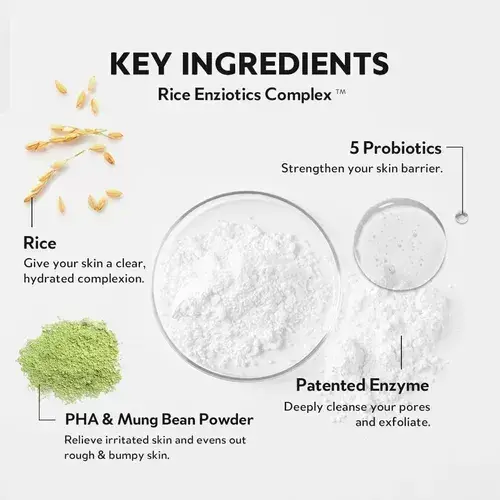Exfoliación suave: Contiene enzima de arroz y polvo de judía mungo para exfoliar suavemente y mejorar la textura de la piel.