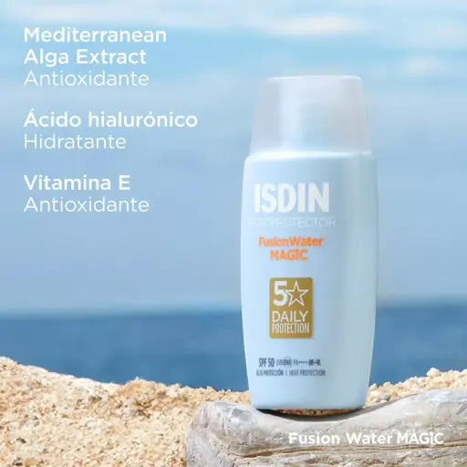 PIEZAProtege tu piel con Fusion Water MAGIC SPF 50, el fotoprotector facial ultraligero de absorción inmediata y uso diario que se funde con la piel y proporciona una alta protección. Hidrata y aporta acción antioxidante.