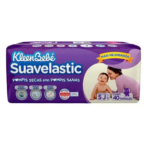 PIEZAPañal Suavelastic Jumbo Etapa 5 con 40 piezas KleenBebé está diseñado para bebés activos de 12 a 15 kg. Ofrece ajuste anatómico, cintura elástica y máxima absorción para mantener al bebé seco y cómodo durante más tiempo. Ideal para el cuidado diario, brindando protección y libertad de movimiento.