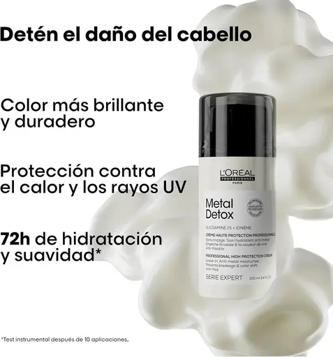 Concentrada con un 1% de glicoamina, esta crema sin aclarado de alta protección elimina el metal* del cabello y lo protege del depósito de nuevas partículas, para detener la rotura y el cambio de color.