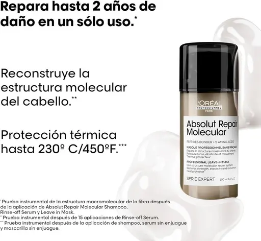 Para obtener los mejores resultados, recomendamos lavar con Absolut Repair Molecular Shampoo y tratar con el suero Rinse Off antes de aplicar