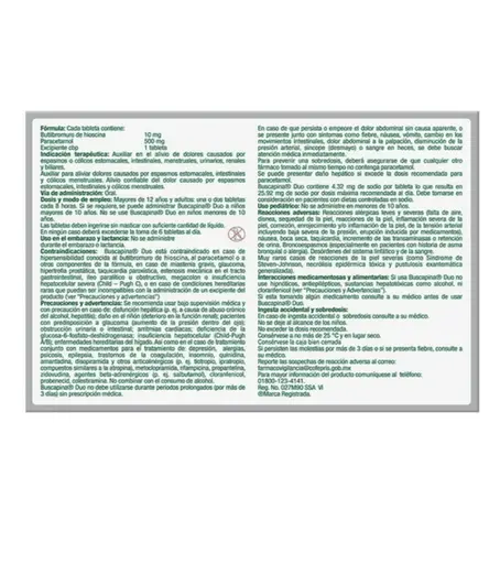 PIEZABuscapina Duo actúa rápido y desde el origen del dolor a partir de 15 minutos, gracias a su doble acción: antiespasmódica y analgésica, es decir que alivia los espasmos y calma el dolor. Gracias a su fórmula con Hioscina y Paracetamol, alivia el dolor de panza y calma los retortijones, lleva contigo su caja con 10 tabletas.