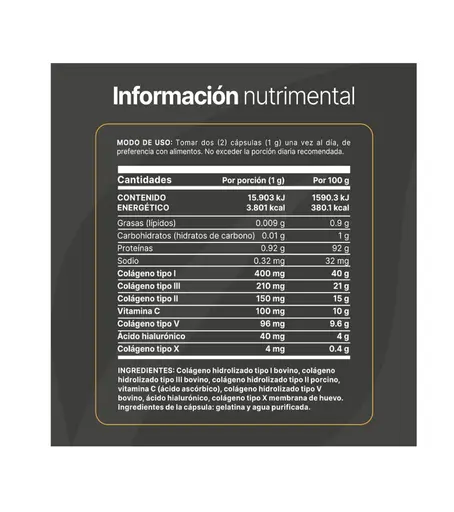 Esta composición especial está complementada con vitamina C y ácido hialurónico, en una práctica presentación en cápsulas.
