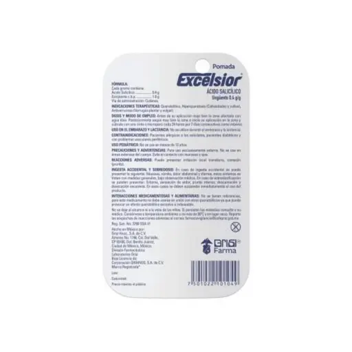 PIEZAExcelsior 8 g Pomada Stick 4 g contiene ácido salicílico, un tratamiento tópico utilizado para tratar afecciones de la piel como verrugas, callos y durezas. Su fórmula ayuda a exfoliar la piel y eliminar las capas afectadas, promoviendo una recuperación más rápida. Se debe aplicar según las indicaciones para obtener los mejores resultados.
