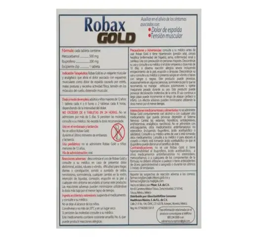 Robax Gold 500/200 mg 24 Tab combina Metocarbamol e Ibuprofeno. Está indicado para aliviar el dolor muscular y la inflamación, además de relajar los músculos tensos o espasmódicos.