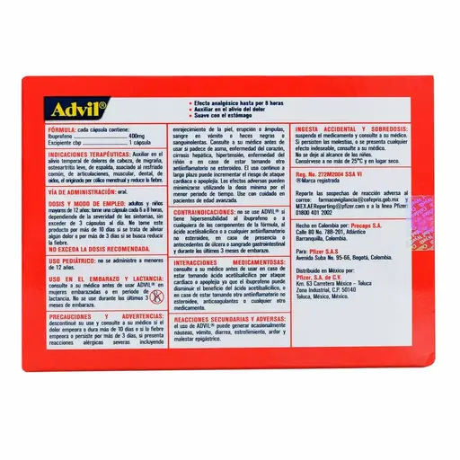 PIEZAAdvil 400 mg es un analgésico y antiinflamatorio que contiene ibuprofeno, utilizado para aliviar el dolor, reducir la inflamación y bajar la fiebre. Con 10 cápsulas por envase, ofrece un tratamiento efectivo para dolores leves a moderados, como dolores musculares, de cabeza o articulares.
